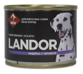 Корм Landor Holistic (паштет) для собак, индейка с черникой Полнорационные влажные корма LANDOR содержат до 66% мяса в составе. Это позволяет покрыть потребность взрослых собак в белке, а также значительно улучшить вкусовые качества влажного корма. Три вида мяса – индейка, гусь и перепелка, позволяют учесть вкусовые предпочтения вашего питомца. Влажные корма LANDOR обладают привлекательным ароматом, который очень важен для собак. Ведь, благодаря огромному количеству обонятельных рецепторов, первое, на что они ориентируются при выборе корма – это его запах. В составе наших влажных кормов нет злаков, что исключает вероятность возникновения пищевой непереносимости растительного белка и аллергии. Если питомцу, по разным причинам, сложно есть твердую пищу, идеальным решением становятся влажные корма, т.к. благодаря их мягкой консистенции, они снижают нагрузку на зубы и челюсти питомца.