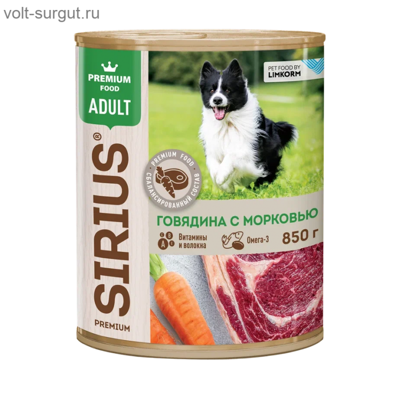 Консервы SIRIUS (Сириус) Говядина\ морковь (850 г) — это влажный полнорационный корм премиум-класса для взрослых собак всех пород.